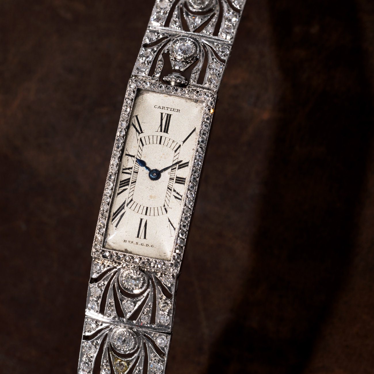 Cartier’s Art Deco creations are famed for their refined symmetry and luxurious detailing, and this magnificent diamond-set wristwatch is a shining example. Dating to the 1920s and manufactured in Paris, this rectangular masterpiece features a white gold case and integrated bracelet, both fully adorned with round and bullet-shaped diamonds. The interplay of negative space and brilliant-cut stones creates a striking sense of lightness and movement. The dial, with its elongated Roman numerals and chemin de fer minute track, is a textbook example of Cartier’s signature style. Stamped “Cartier, Paris, Bté S.G.D.G.,” this breathtaking piece is a wearable expression of the Roaring Twenties and a jewel of historic and artistic value. View Lot