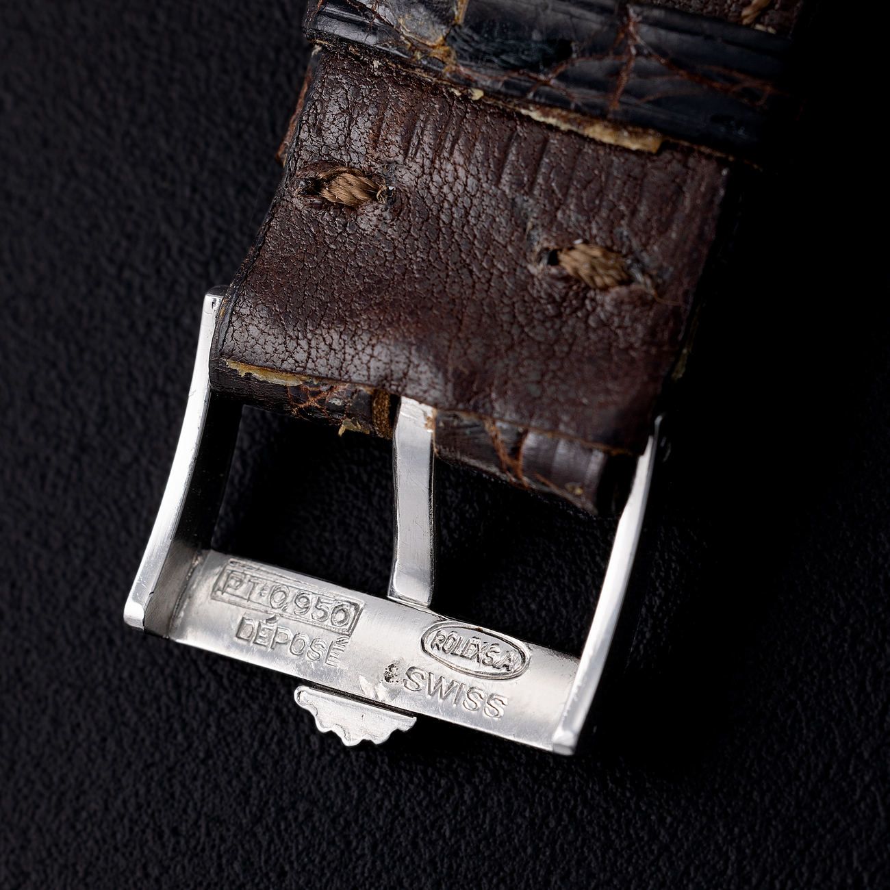 This incredible Datejust houses a matte, dark grey dial adorned with applied baguette and brilliant cut diamond indexes, alongside the prestigious Officially Certified Chronometer (OCC) designation at 6 o’clock. The “S&L” insignia on the case back, denoting Serpico Y Laino, not only highlights its exclusivity but also its well-preserved condition and minimal wear. The almost unique original platinum buckle, clearly demonstrates the fact that the watch was sold on a leather strap and differentiates it from most of these models that were sold on a bracelet.
