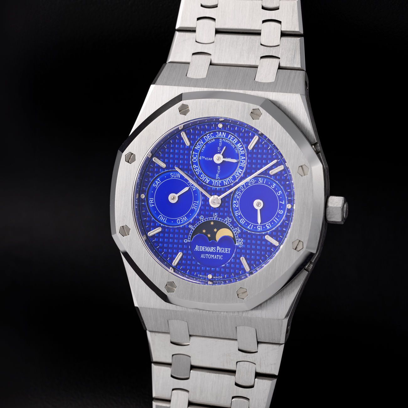 Lot 32 is a truly outstanding and very rare 2000’s Royal Oak Quantieme Perpetuel, reference 25820ST, in stainless steel with the ultra sought-after "Yves Klein’ Electric Blue coloured dial. A truly fantastic specimen of Royal Oak Perpetual 39mm ! Presented in perfectly preserved conditions accompanied by the Extract From the Archives.