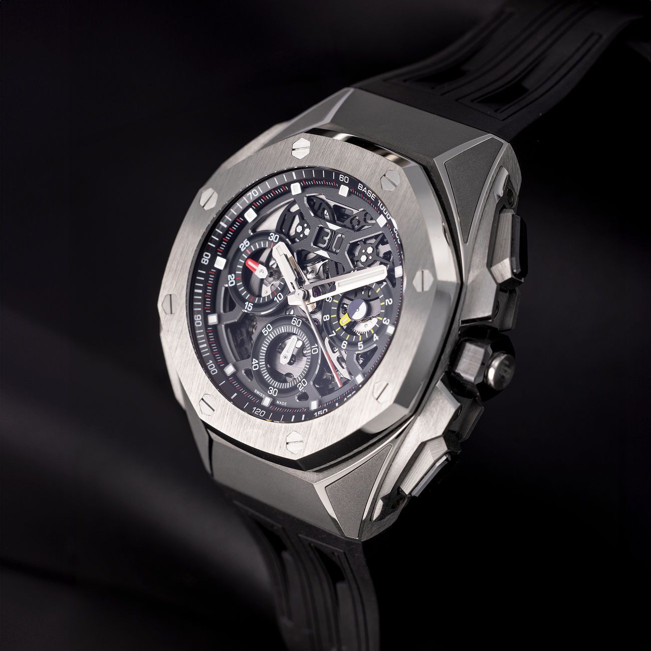 Lot 119 is the brand new release from 2023, that is reserved for VIP clients, the Royal Oak Concept Split-Seconds Chronograph GMT with date indicator, reference 26650TI, in titanium ! Presented in new never worn condition and accompanied by its full set of original box and warranty. A truly magnificent and latest creation of the iconic ‘Concept’ Royal Oak model line by Audemars.