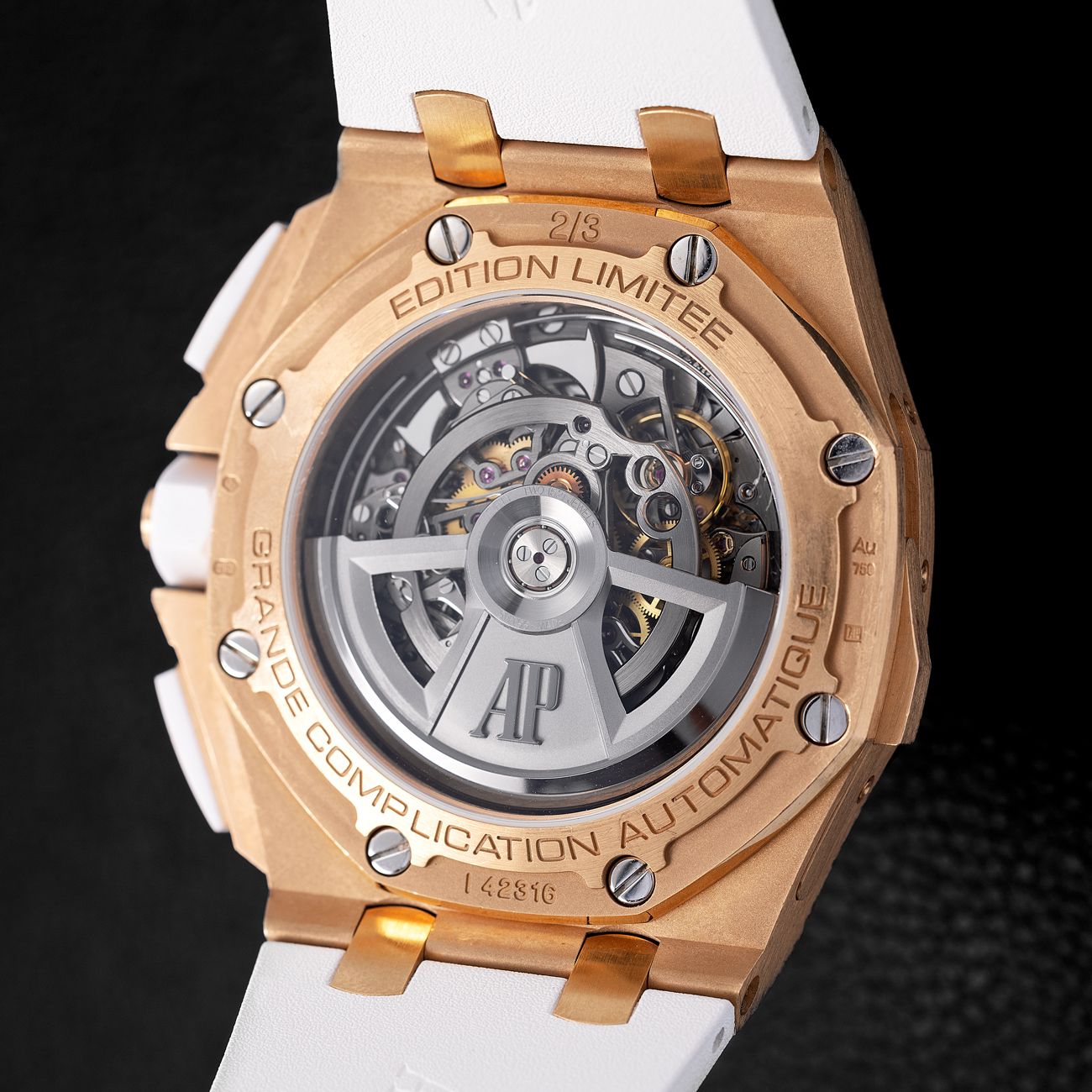 Lot 212 is the very rare and ultimate Grand Complication Royal Oak OffShore reference 26571RO Minute Repeater, Perpetual Calendar, Split-second Chronograph, Automatic Wristwatch in Pink Gold with Black Ceramic bezel. In stunning new condition with original box and warranty. One of only three pieces ever made !