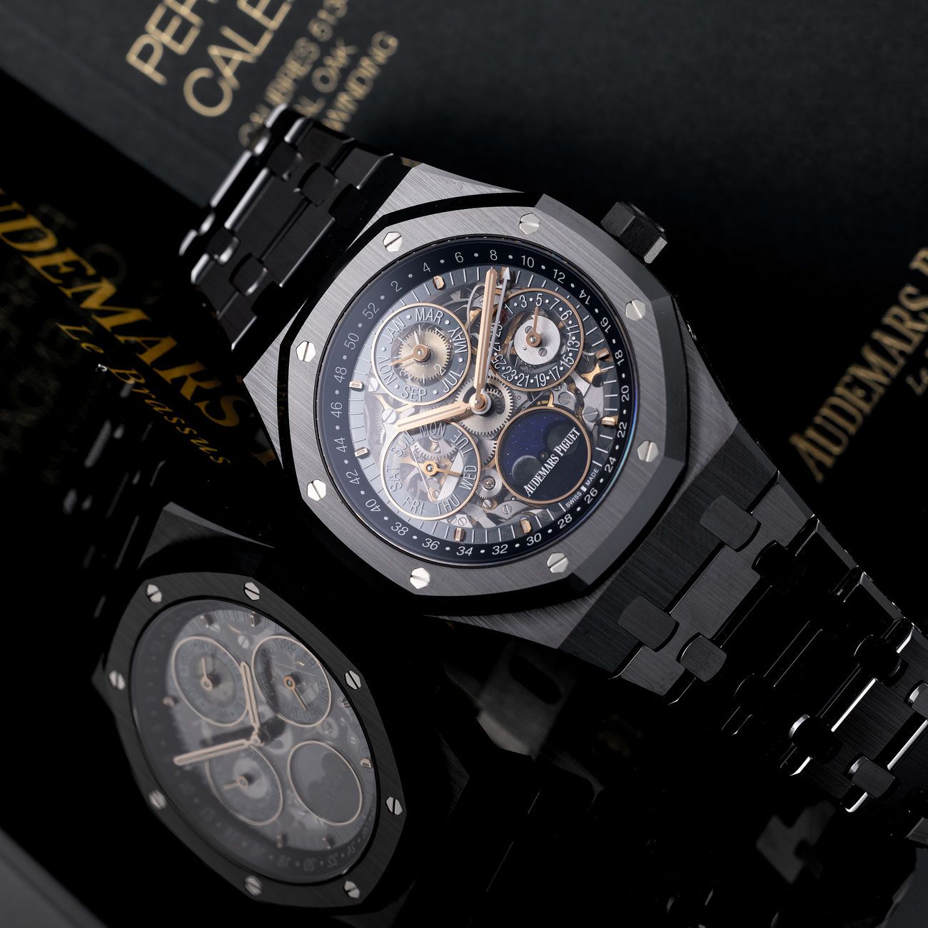 Lot 255 is the ultra sought-after Royal Oak OpenWork Perpetual Calendar, Moon Phases and Leap and Week Year Indication, reference 26585CE, in Black Ceramic from 2021. Presented in like new and untouched condition, bearing its full set of original box, papers and additional links !