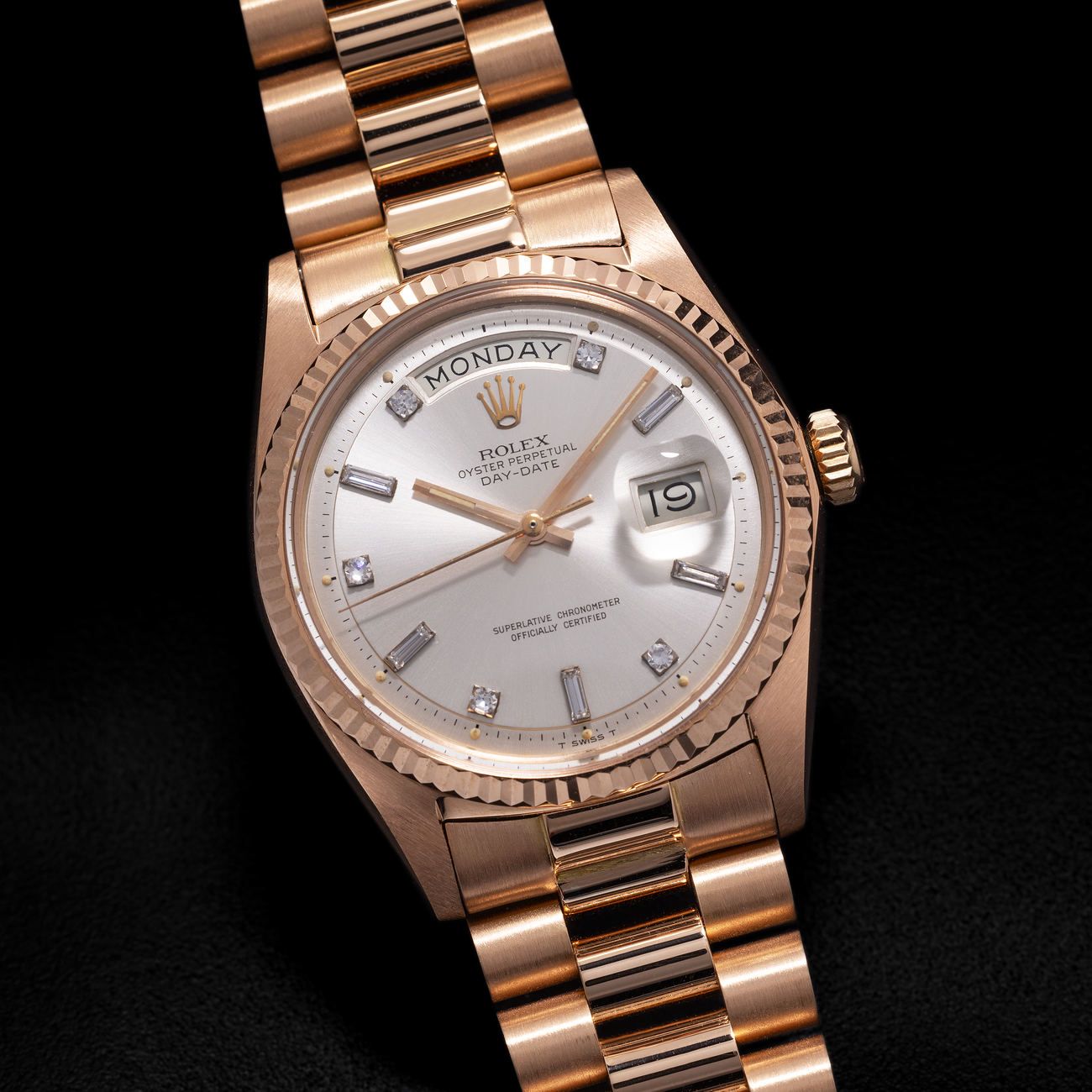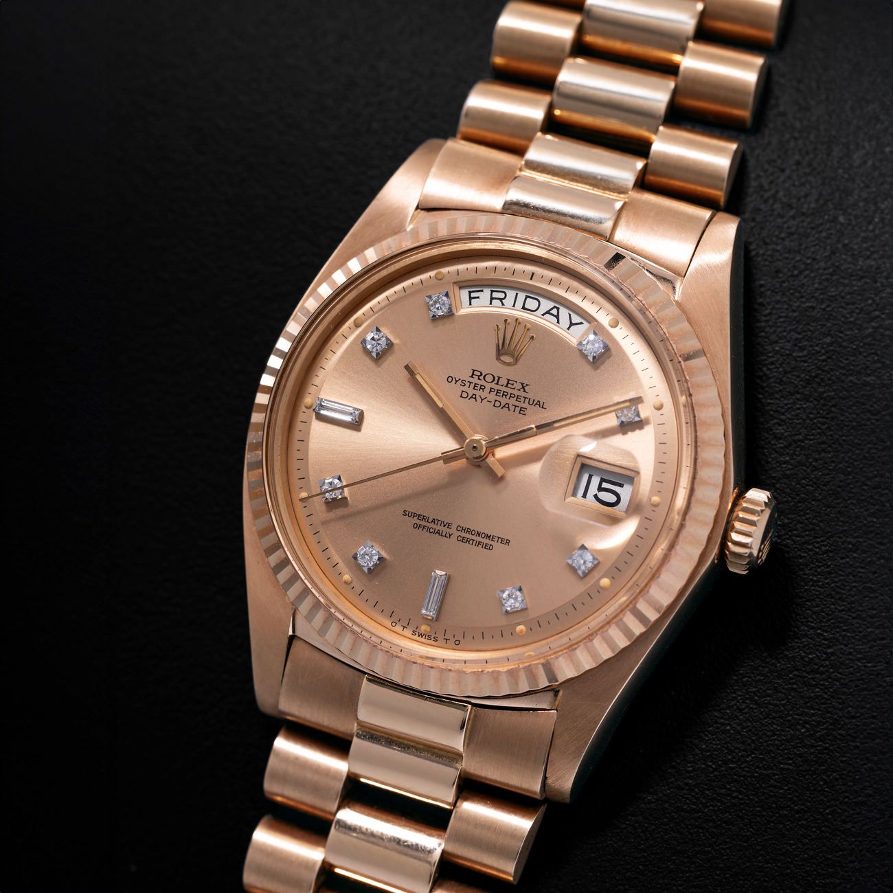 Lot 161 – Distinguished by its rare baguette and brilliant diamond-set dial, the 1970 Day-Date Reference 1803 in pink gold embodies refined elegance and sophisticated craftsmanship, offering a glimpse into the luxurious world of Rolex Day-Dates.