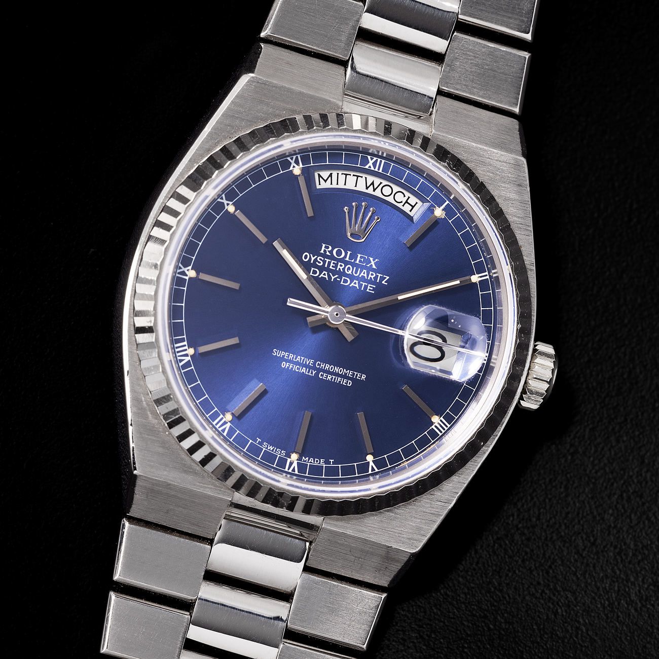 Lot 99 – The 1978 Oysterquartz Day-Date in white gold, Reference 19019, with its electric blue dial, marks Rolex's foray into the quartz movement. Celebrated in “Collecting Rolex Wristwatches” by Osvaldo Patrizzi, this piece stands as a testament to innovation and has its own unique and distinctive style.