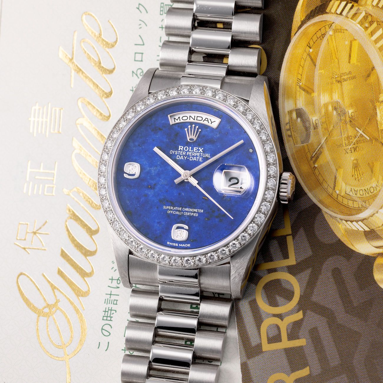Lot 110 – With its lapis lazuli dial and diamond-set bezel, the 1996 Day-Date Reference 18346 in platinum captures the essence of Rolex innovation in the sue of natural materials for its dials. Accompanied by box, papers, warranty, tags, and cloth, this timepiece transcends mere timekeeping to become a symbol of enduring elegance.