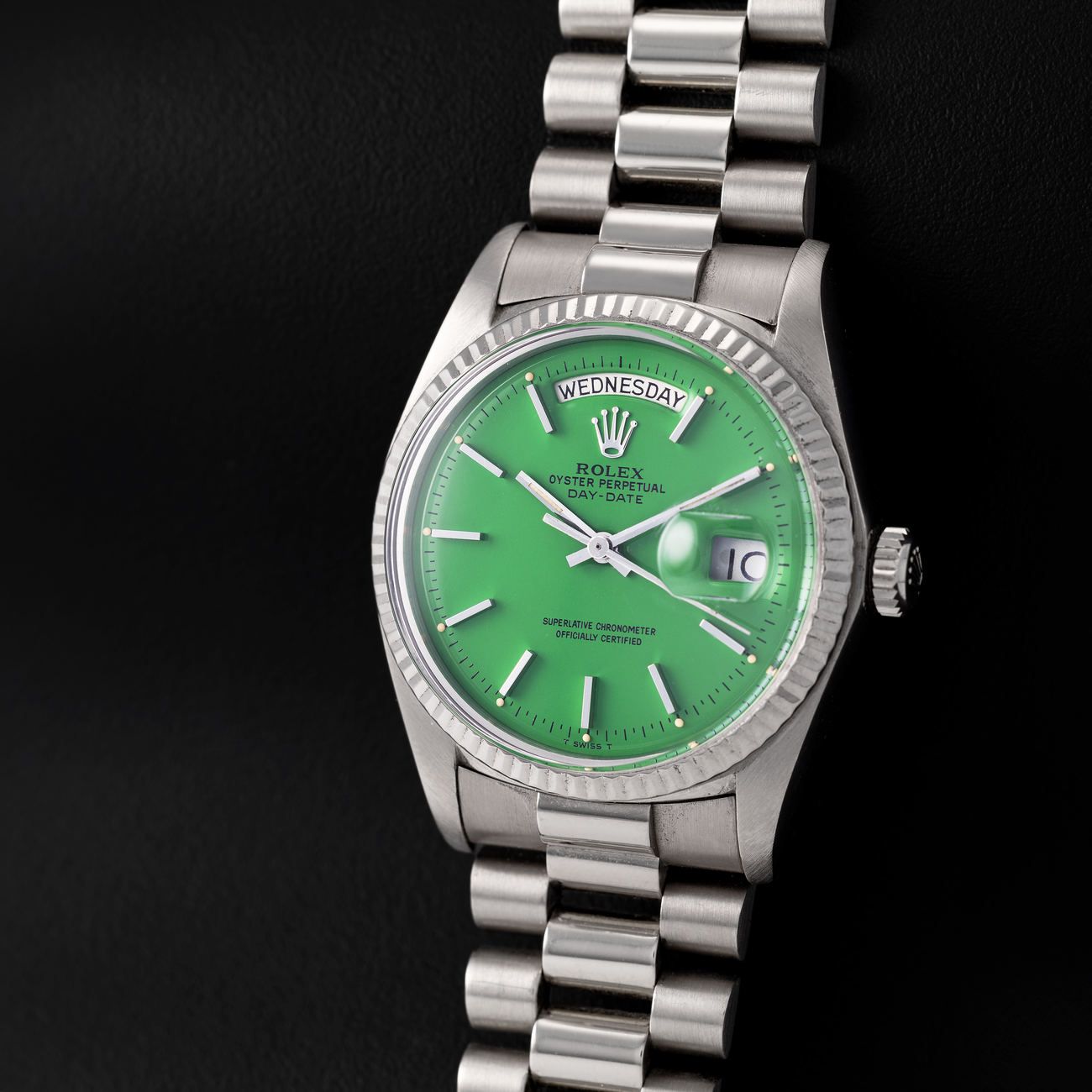 Lot 139 – The 1973 Day-Date Reference 1803 in white gold, featuring an emerald green Stella dial, epitomizes Rolex's innovative spirit. This rare and captivating piece showcases Rolex’s incredible use of vibrant colours and deep lacquered finishing on its dials.