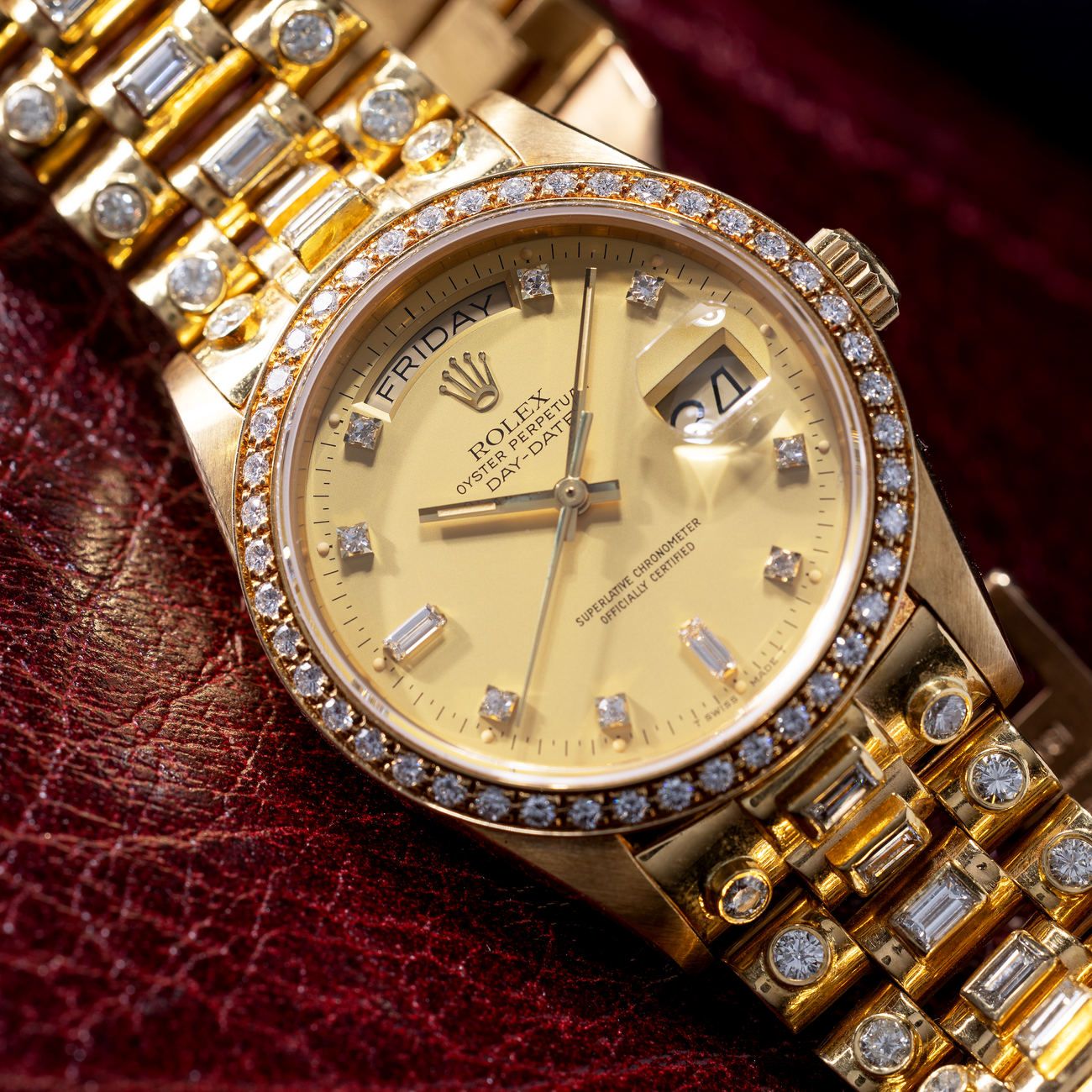 Lot 181 – Featuring a champagne diamond-set dial and bezel, the "Octopus" Day-Date from 1985 (Reference 18048 in yellow gold) is a marvel of Rolex craftsmanship. Its full set, including box, warranty, papers, pochette, and tag, adds to its allure, making it a potential centrepiece for any collection.