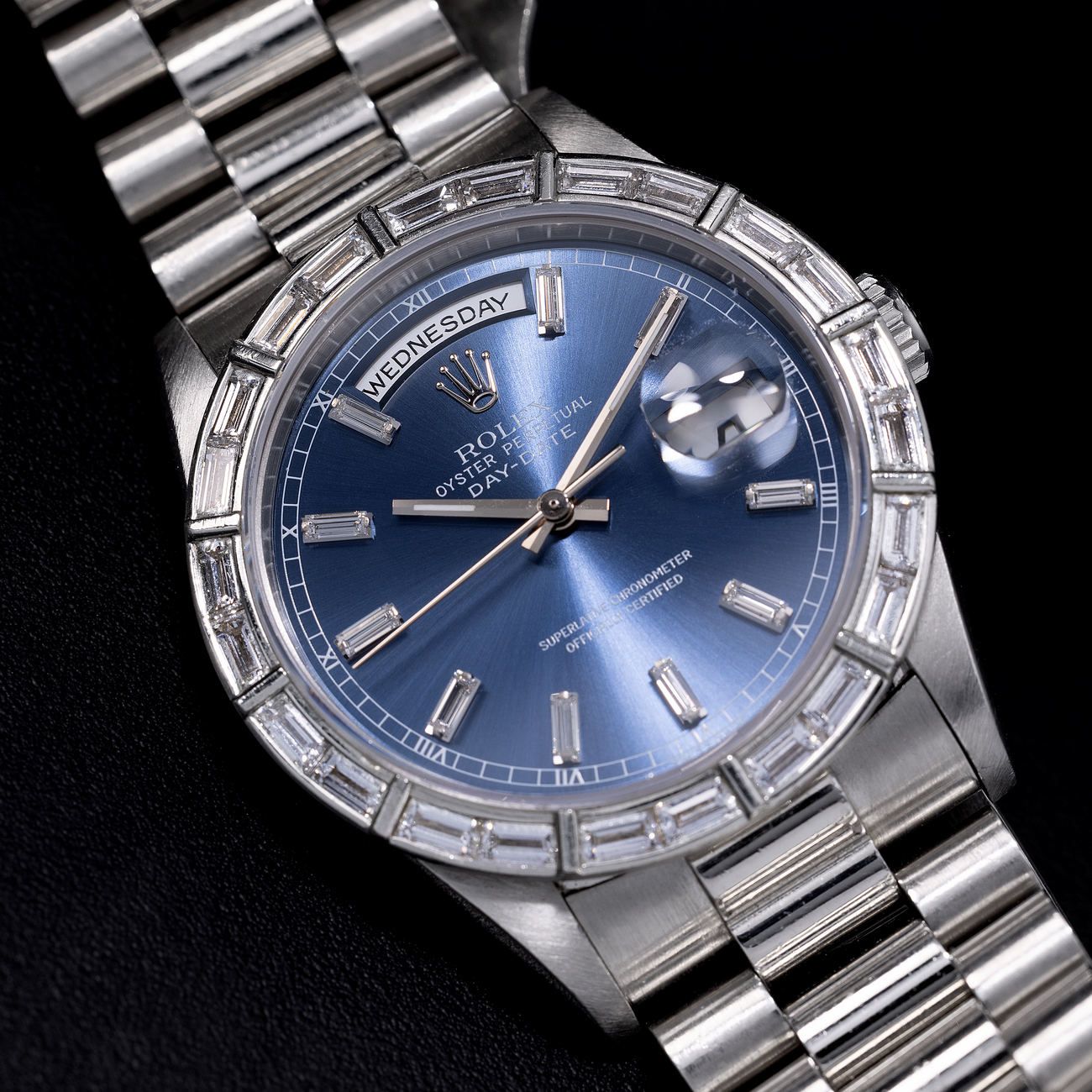 Lot 191 – A testament to luxury, the 1990 Day-Date Reference 18366 in platinum, adorned with a baguette diamond set bezel and dial, reflects Rolex's mastery in creating exceptional timepieces, offering collectors a masterclass in stone-setting.