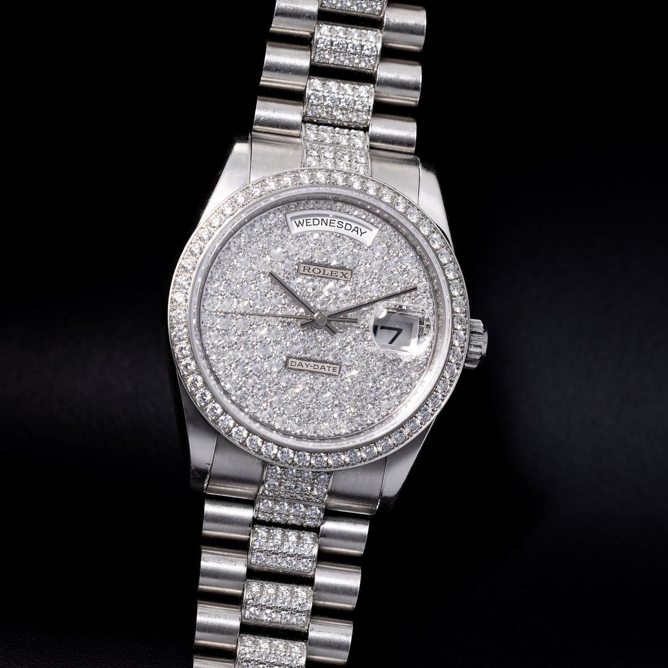 Lot 259 – The 2006 Day-Date Reference 118346 in platinum, with an XL diamonds dial, diamond-set bezel, and bracelet, is arguably the definition of luxury. Its wonderful preservation and the presence of the original warranty, offers connoisseurs the chance to own a piece of Rolex's history.