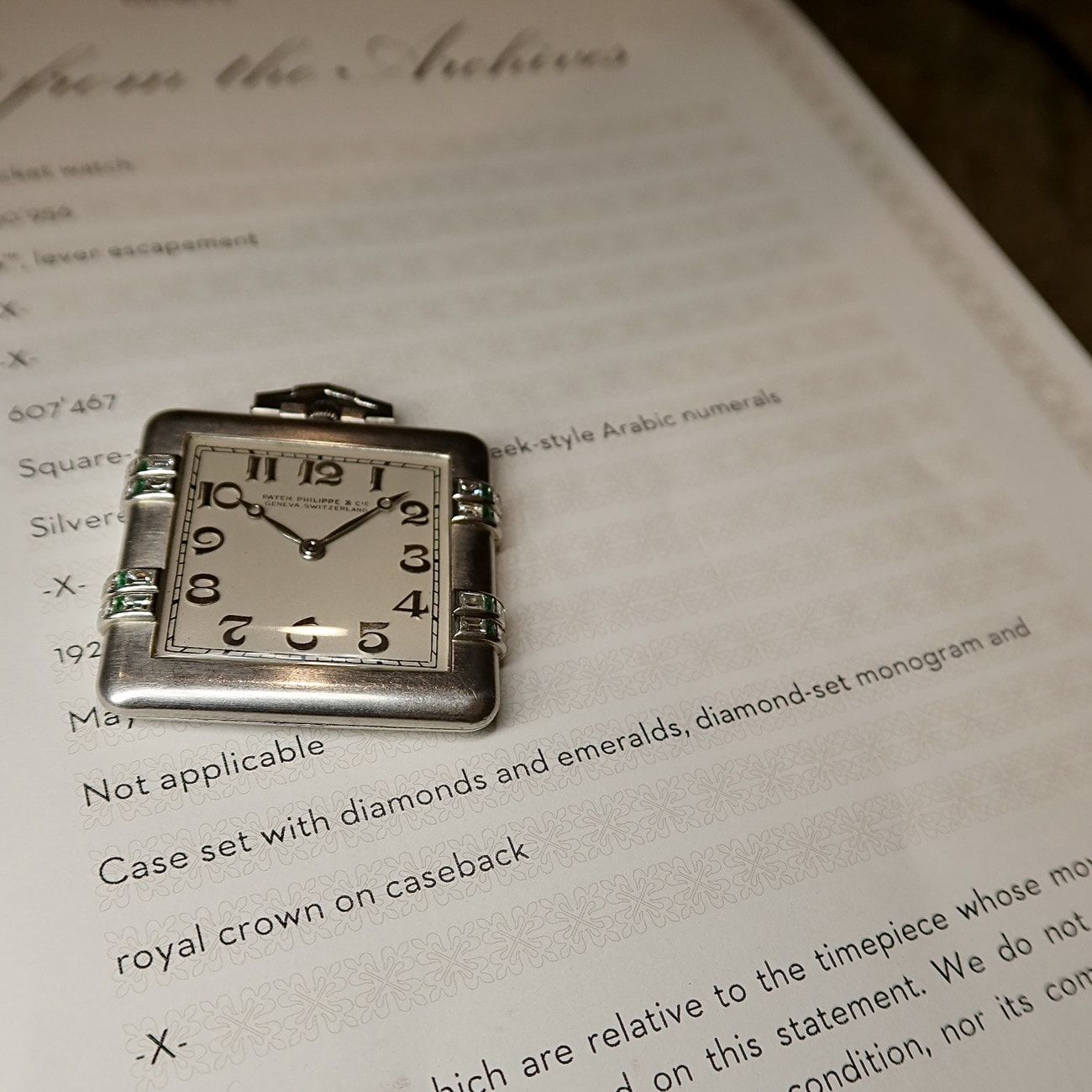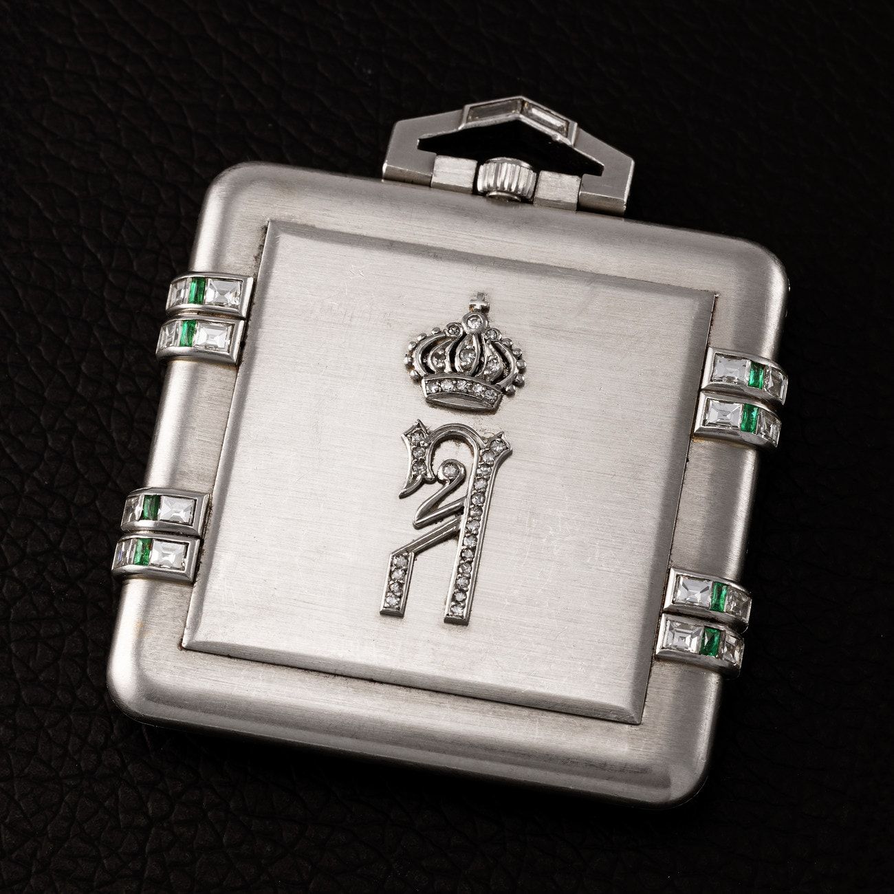 The pocket watch's design is as remarkable as its history. Its platinum case features an unusual square shape, a rarity for Patek Philippe pocket watches, and is adorned with exquisite diamond and emerald decorations, enhancing its preciousness and appeal. Furthermore, the use of emeralds at the time was an extremely rare and valuable configuration which brings testimony of its overall importance. The back of the watch features a coat of arms with a crown, underscoring its origin as a personal request from King Alexander I, a monarch who played a pivotal role in the Kingdom of Yugoslavia's history. The watch's silver-toned dial, black enamel outer track, Breguet numerals, and Breguet-style hands collectively confirm the special nature of this incredible timepiece.