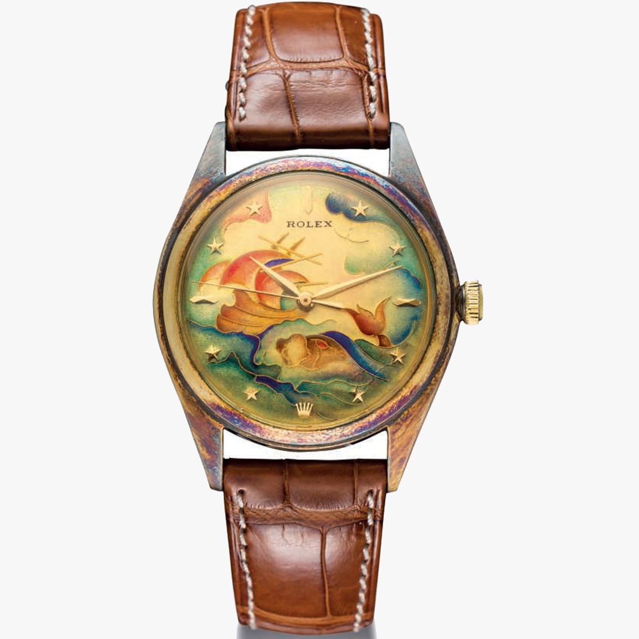 In 2014, an oversized 36mm case Rolex enamelled wristwatch ref. 5029/5028 with dial depicting a whale and a frigate in full sail cruising through stormy seas, surfaced the auction market and fetched a remarkable price of 1.250.000$.