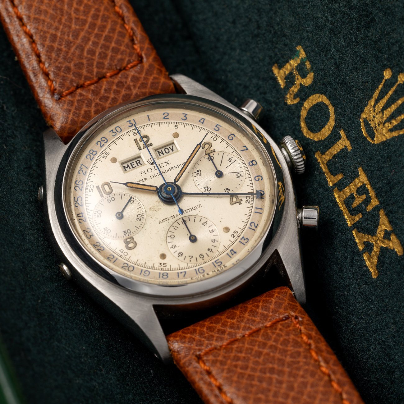 This exact watch last appeared publicly at Christie’s Geneva in 2013, where it sold for CHF 387,750, a testament to its importance and desirability. Its reappearance today represents a rare second chance for collectors to acquire one of the most significant early Rolex complications ever made.
