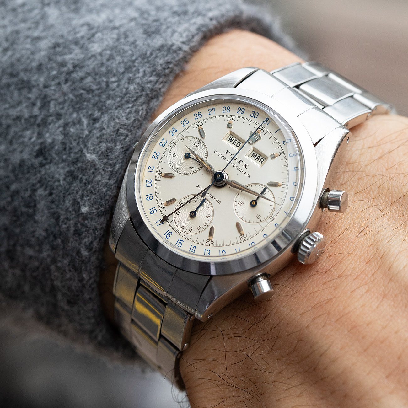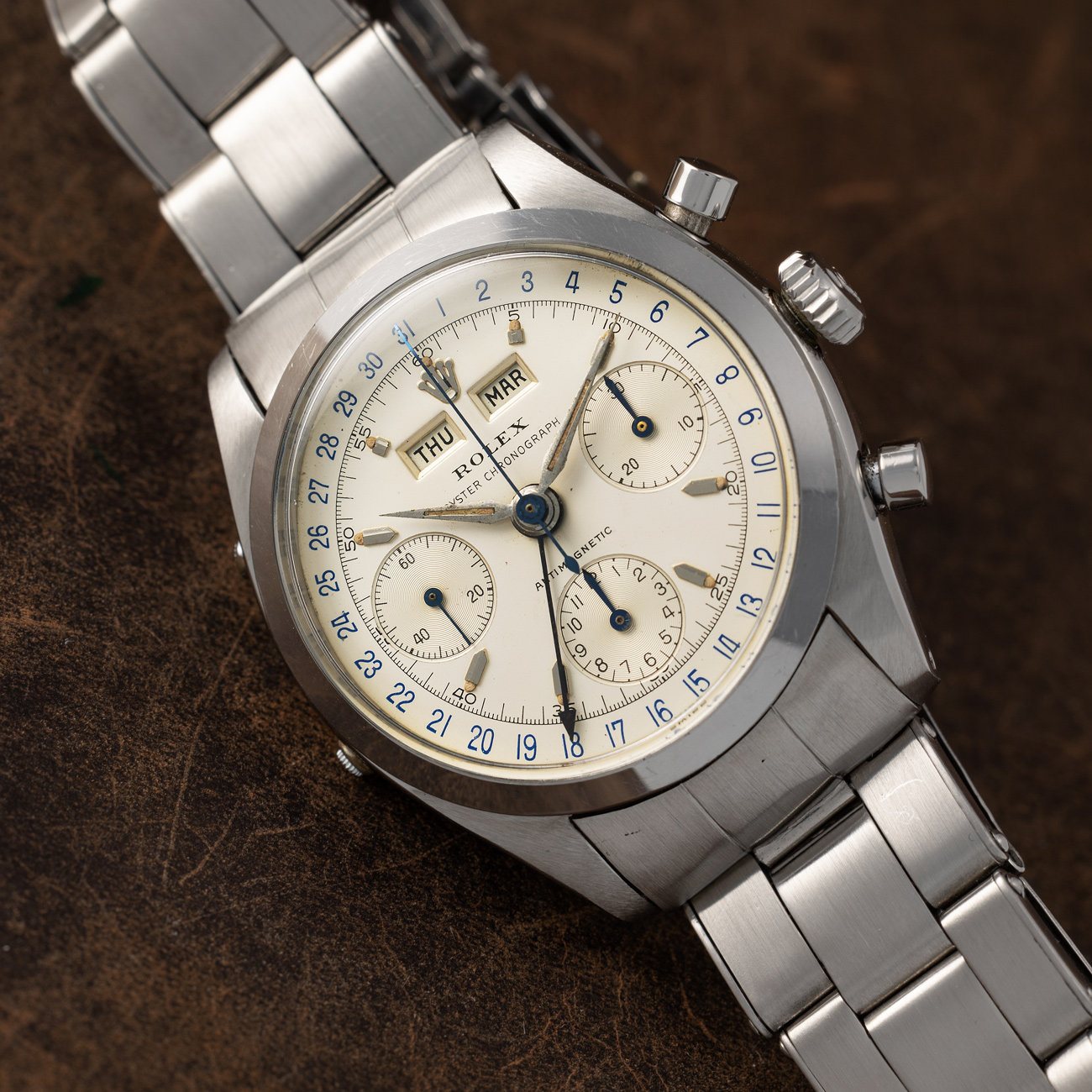 Lot 37 in our April sale represents one of the finest surviving examples. Housed in a 37 mm stainless steel case with sharp lines and original proportions, the watch is believed to be one of only around 30 known examples in steel, out of a total production of approximately 400. Its two-tone silvered dial features luminous Arabic numerals and an outer date track, paired with an exceptionally rare luminous handset. The balance of aesthetics and legibility in this early execution is extraordinary.